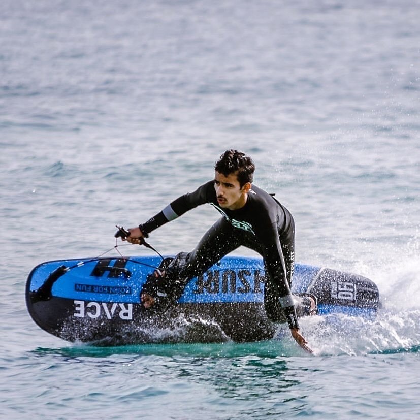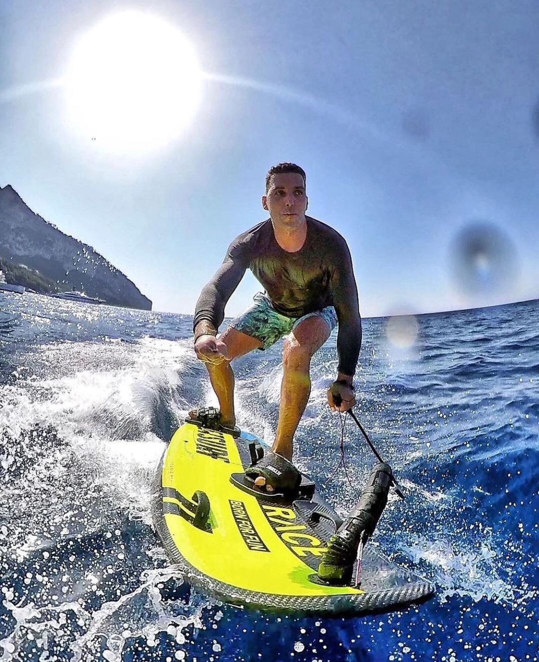 Acceleration, balance, maneuvers… Everything is up to you. The JetSURF control knob is used to start the motor, control traction and keep your balance. In case you fall off the surfboard, a magnetic safety key triggers and the motor immediately shuts off.